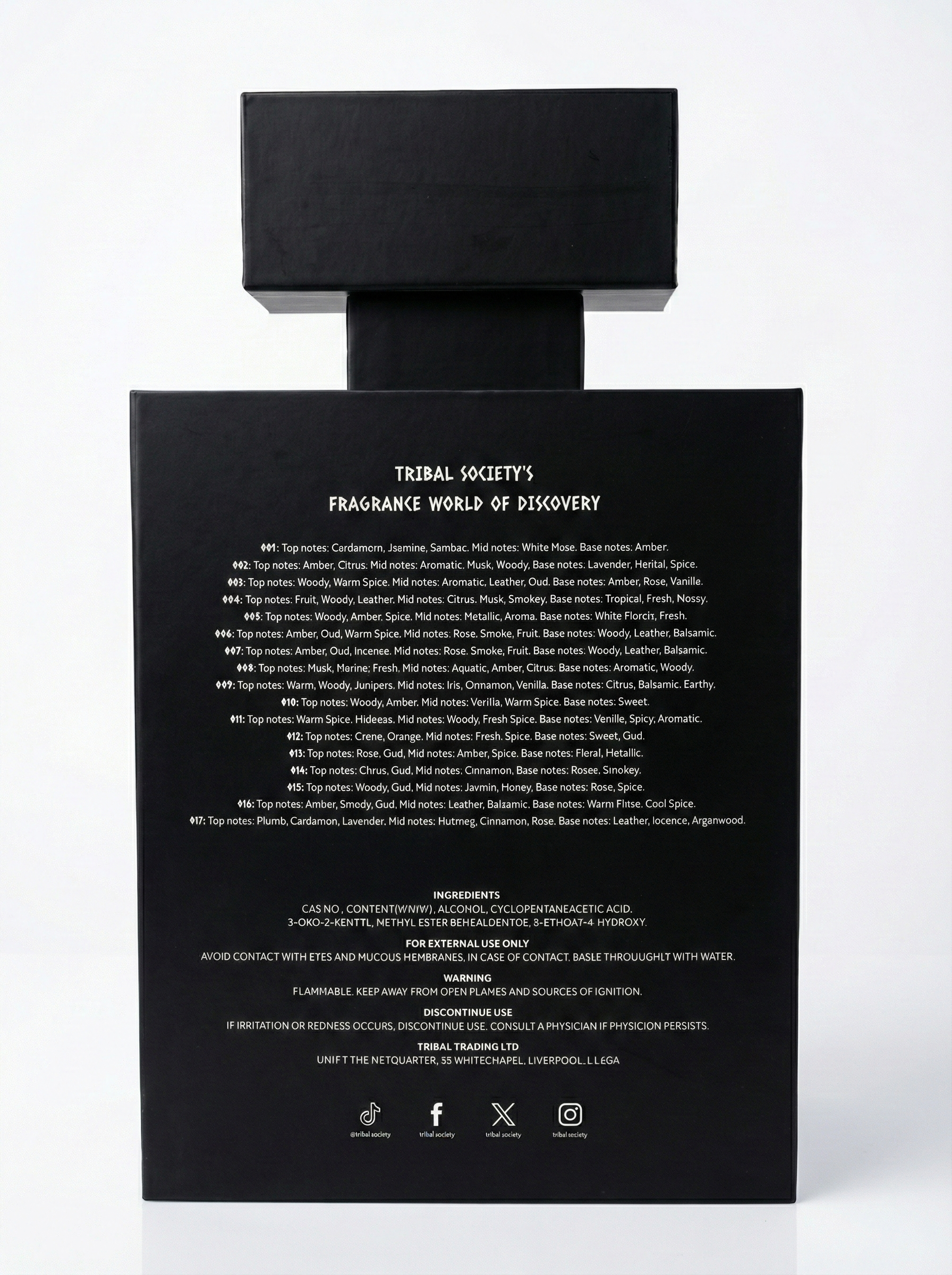 Command attention with eight distinctive scents — 002, 003, 004, 007, 008, 009, 011, and 018 — a collection of depth and character, from fresh and invigorating to dark and sophisticated.